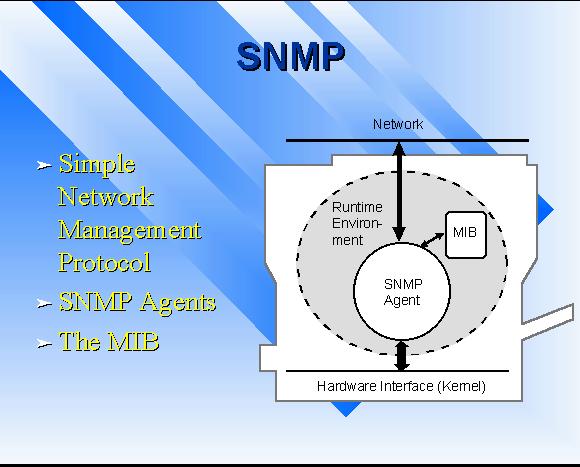 Here we see a SNMP Agent which runs inside a printer. The SNMP Agent queries the printer hardware for information, such as number of pages printed or printer status in our printer example, and stores pertinent information in the MIB (Management Information Base – a database that contains information about the device).